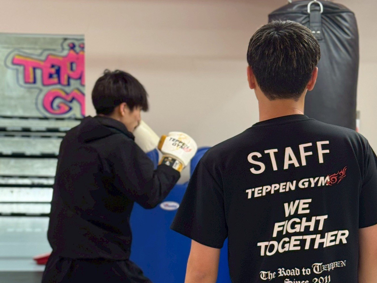 準備体操→縄跳び(2分×2R)→膝蹴り連打→シャドーボクシング→タッチゲーム・対面シャドー→サンドバッグ→ミット→整理体操